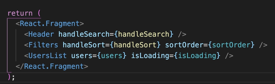 If you see, UsersList component accepts users and isLoading props and Filters component accepts handleSort and sortOrder prop.