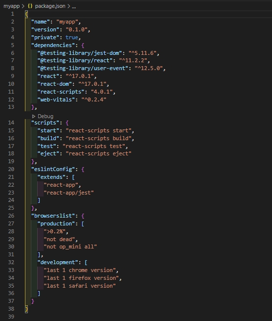 “package.json” is the definition of react js projects. This is how it looks after creating a new app as of “updated date”: (react ver: 17.0.1)
